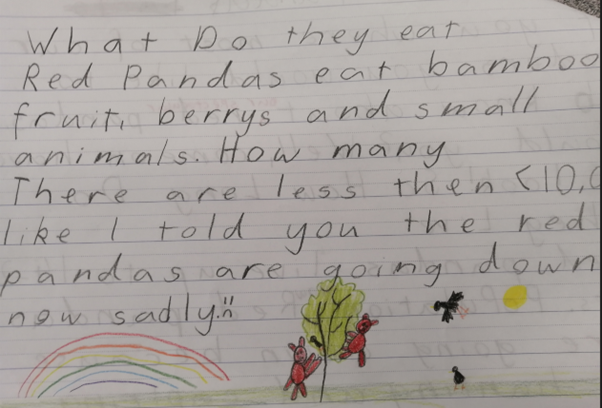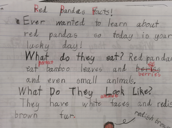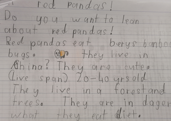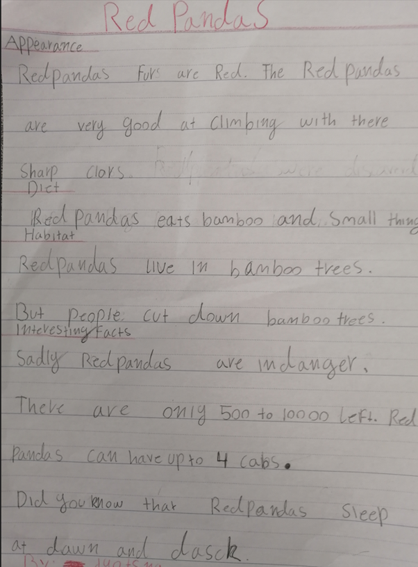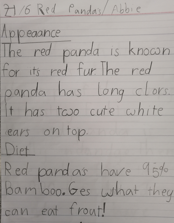 These are examples of some of the reports students wrote about red pandas. The students watched a short video on red pandas, then wrote their information report.