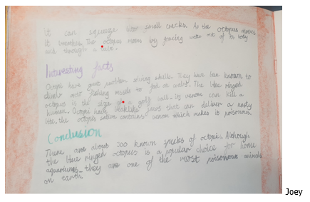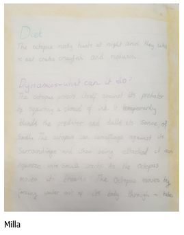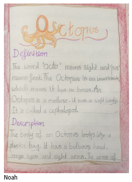 The students wrote an information report of the octopus. It included the subheadings relevant to the genre of an animal information report.