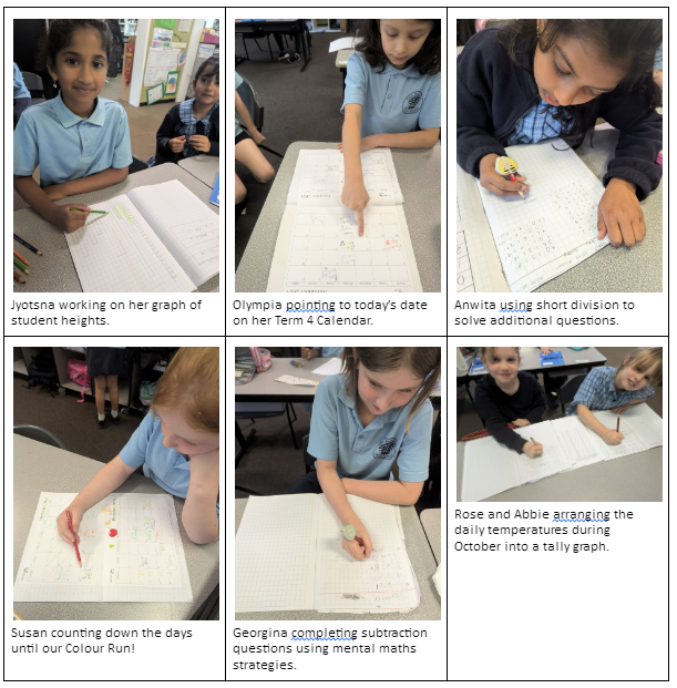 Year One and Two students in our classes will spend the second half of Term Four revising concepts across the maths strands: Number, Algebra, Measurement, Space, Statistics and Probability. These photos are a quick snapshot of our classroom over the last few days.
