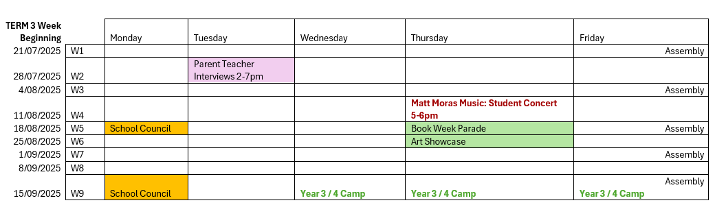 You’ve spoken, and we’ve listened! Starting next term, we’ll be returning to sharing a fortnightly calendar snippet so you can easily see upcoming events and stay informed. Here is a quick look at what is planned for Term 3 so far.