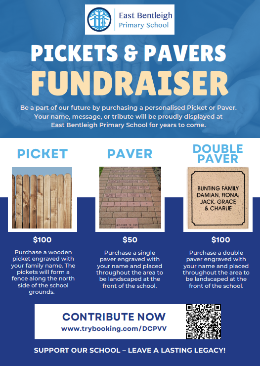 Hopefully you have seen some posters around the school for our Pickets & Pavers fundraiser. This is a chance to make a lasting contribution to the school as we look to finish the outdoor learning classroom, create some landscaping, and help fence the prep play space.
